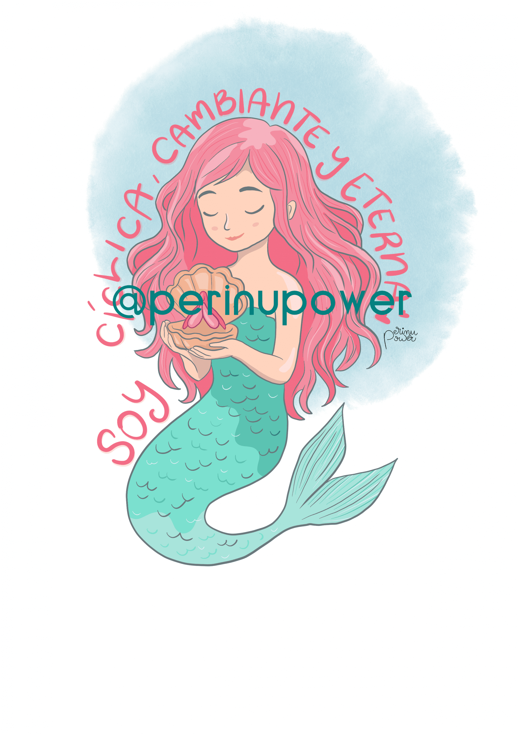 lustración que celebra la naturaleza cíclica del cuerpo y de la vida. Una sirena sostiene con delicadeza una concha, símbolo de los ritmos internos, la transformación y la sabiduría que habita en el cambio constante.