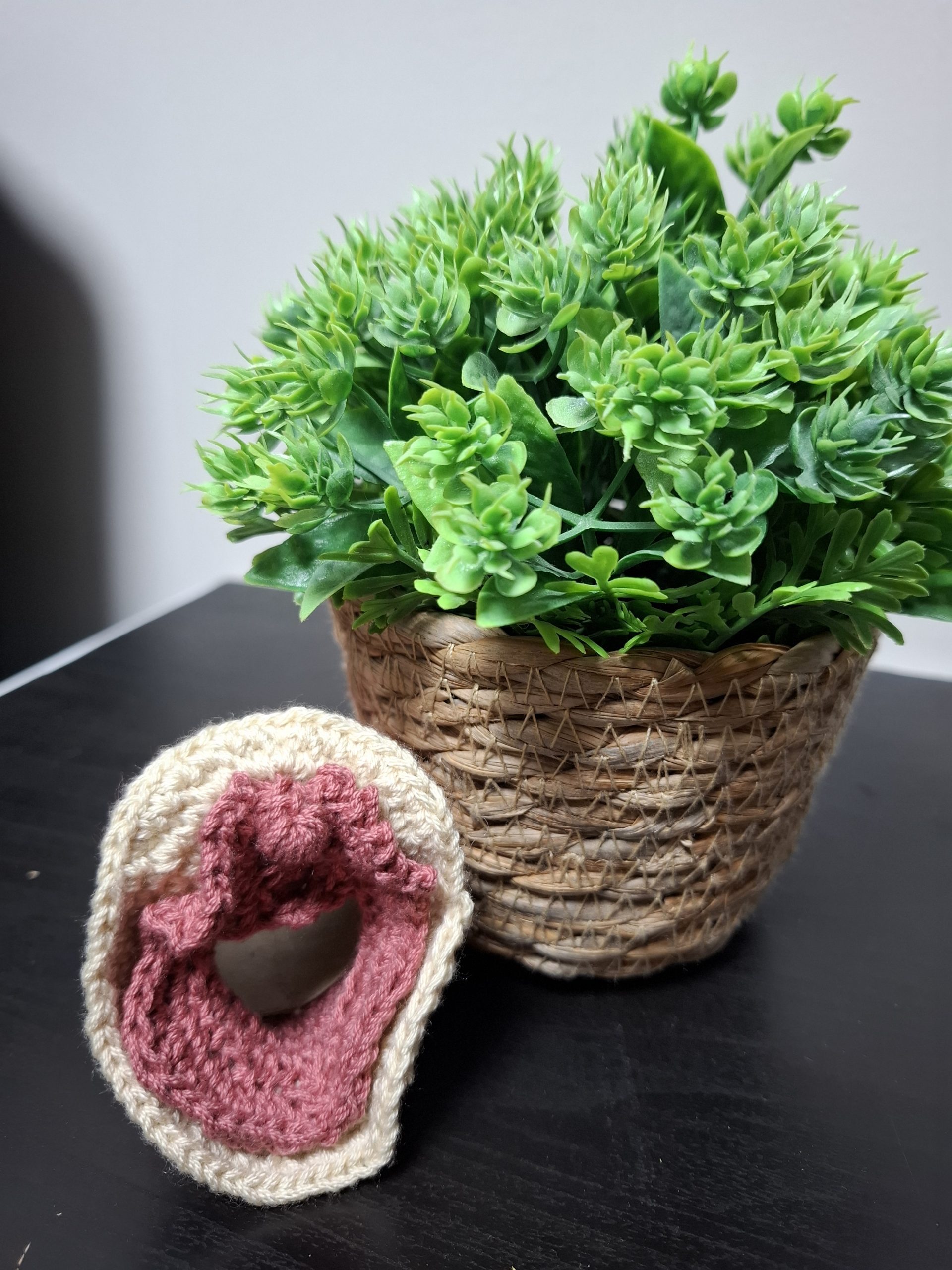 Vulva tejida a mano en crochet, diseñada para representar la diversidad y la belleza de los cuerpos reales. Una pieza educativa y simbólica que invita a la aceptación y al autoconocimiento. Diámetro de la vagina (tubo de papel higiénico).